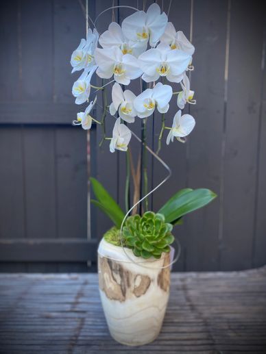 cascading phalaenopsis orchids in choice of color, beautifully designed in curated vessel, dressed with decorative moss and/or accent succulents.