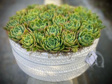 hand-picked selection of beautiful succulent florets in a green/blue palette, artfully designed in a ceramic, wood or concrete vessel. great for indoor enjoyment, then moved outdoors for long life.